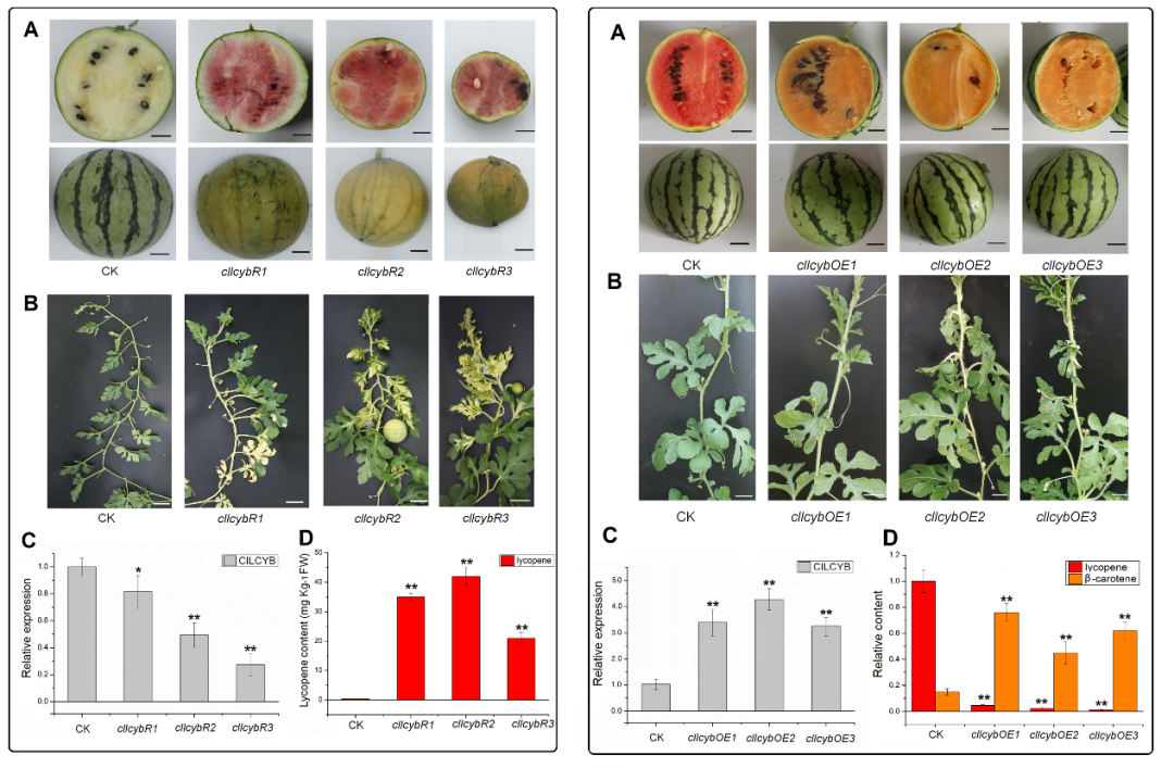 市场上商品西瓜的红瓤十分鲜艳,其富含番茄红素,不仅好看而且营养丰富;但西瓜原始野生种的瓤色却是白色或黄色。为了揭示西瓜鲜艳瓤色是如何驯化产生的分子机制,研究团队通过对红瓤控制位点的精细定位及西瓜属5个种的 221份代表性瓤色资源的序列分析,发现了西瓜番茄红素环化酶 Cl LCYB 是西瓜红瓤控制基因。研究发现该基因中两个引起氨基酸变化的位点与红瓤表型紧密连锁,遗传转化试验结果也证实了 ClLCYB 是控制红瓤的关键基因。根据基因序列分析揭示了红瓤西瓜品种有相对保守和独立的驯化过程。亚细胞定位及催化功能研究表明:不同瓤色西瓜中该基因编码蛋白均定位在果实细胞有色体中,都具有将番茄红素催化为β胡萝卜素的能力,且催化活性差异不大。研究还发现该基因在不同瓤色西瓜品种、果实不同的发育时期的转化水平变化不显著。进一步通过对该基因蛋白水平的检测,最终发现该ClLCYB蛋白积累水平与番茄红素的积累呈现负相关性。 图 1通过降低或提高红瓤基因 ClLCYB 表达可以控制西瓜瓤色形成 上述证据表明,不同瓤色西瓜中该蛋白中两个氨基酸的替换引起了该蛋白稳定性的差异,从而导致了其底物番茄红素的积累产生了红瓤西瓜。 该 研究揭示了西瓜红瓤基因转录后翻译及蛋白水平调控是果肉细胞有色体发育以及类胡萝卜素代谢控制的有效途径。该研究为丰富类胡萝卜素代谢途径调控理论和高品质西瓜育种提供了理论依据。 许勇团队在西瓜瓤色控制研究领域取得了多项研究成果。此前已发表了“西瓜瓤色控制基因的精细定位”、“有色体磷转蛋白基因ClPHT4;2高量表达是西瓜瓤色形成的必须条件”等相关研究论文。团队系列研究结果不仅丰富了果实有色体发育及其进化机制,并且已经应用于高品质西瓜育种实践中,一系列多彩瓤色西瓜品种正在产业中大面积推广,实现了论文写在大地上。 本论文第一作者为张洁 副研究员,通讯作者为许勇 研究员。研究工作受到国家重点研发计划、国家自然科学基金,北京学者、北京高创计划等多个项目资助。